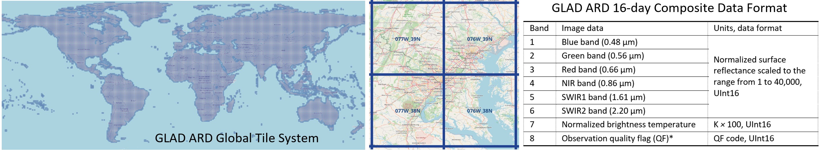 GLAD Landsat ARD Tools The Landsat Analysis Ready Data (ARD) created by the Global Land Analysis and Discovery team (GLAD) serves as a spatially and temporally consistent input for land cover mapping and change detection at global to local scales. The GLAD ARD represents a 16-day time series of globally consistent, tiled Landsat normalized surface reflectance from 1997 to the present operationally updated every 16 days. Accessible through a dedicated Application Programming Interface (API) without any associated charges, the GLAD ARD imposes no restrictions on subsequent redistribution or use, provided proper citation is given following the Creative Commons Attribution License (CC BY). In addition to the ARD dataset, the GLAD team has developed the GLAD Tools software suite. This suite enables users to apply time-series data processing, spectral and temporal data analysis, and machine-learning characterization to the GLAD ARD. The GLAD Tools User’s Manual supports users in applying the latest version of the software for national and regional land cover characterization, change assessment, and area reporting, incorporating state-of-the-art mapping and sample analysis techniques. Together, the global GLAD ARD and GLAD Tools provide an end-to-end solution for no-cost Landsat-based natural resource assessment and monitoring at national to global scales. GLAD ARD Data Format The GLAD ARD represents a 16-day time series of globally consistent, tiled Landsat normalized surface reflectance and brightness temperature. Within each 16-day interval, the GLAD ARD preserves Landsat observations with minimal cloud and shadow contamination. These data composites are stored as 8-band, 16-bit unsigned, LZW-compressed GeoTIFF files, in geographic coordinates, featuring a spatial resolution of 0.00025 degrees per pixel, equivalent to 27.83 meters per pixel at the Equator. The product utilizes the World Geodetic System WGS84 (EPSG:4326) The global Landsat ARD product is organized into 1x1 geographic degrees tiles, each comprising 4004x4004 pixels, with a 2-pixel overlap. Tile nomenclature is derived from the tile center's integer value in degrees. The global GLAD ARD tile database is accessible online. Landsat image data collected in a 16-day interval are consolidated into a single ARD composite. A year encompasses 23 composites (GeoTIFF files), each assigned a unique numeric ID starting from the first composite in 1980. The 16-day interval ID table is available online. In 2022, the GLAD team updated the ARD product using Landsat Collection 2 data. Collection 2 offers enhanced geometric accuracy and radiometric calibration compared to Collection 1 products. The entire ARD dataset from 1997 to the present has undergone this update, resulting in the decommissioning of the ARD Collection 1-based product. GLAD ARD Data Access The global Landsat ARD is available for download using dedicated ARI which provides access to 16-day tiled composites (GeoTIFF files). A user must select tiles and 16-day intervals for ARD download from the global metadata. The GLAD Tools software includes tools for automated ARD data download. See GLAD Tools User’s Manual for data download and organization instructions. To access an individual 16-day composite from GLAD cloud storage, a user may implement API commands in cURL or Wget command-line utilities. Example of API data download command for a single ARD tile (105E_13N) and single interval (920): curl -u : -X GET https://glad.umd.edu/dataset/glad_ard2///.tif -o /.tif and - the default API credentials are: Username: glad; Password: ardpas. - the ARD tile name. - tile latitude, the second half of the ARD tile name (e.g., for the 105E_13N, is 13N). - the 16-day interval ID (e.g., 920). - output path. Alternatively, GLAD ARD can be accessed from the Amazon Web Services (AWS) S3 cloud storage. Presently, only a portion of the global ARD data is available on AWS S3. New data may be added upon request to Peter Potapov. ARD data on AWS S3 is provided as public access and is free to download or use in the cloud. The path to the ARD data from S3 is: /vsis3/glad.landsat.ard/data/tiles///.tif - the ARD tile name. - tile latitude, the second half of the ARD tile name (e.g., for the 105E_13N, is 13N). - the 16-day interval ID (e.g., 920). GLAD Tools The GLAD Tools is a collection of freeware utilities that enable advanced ARD data analysis and land cover and land use change assessment, including: Landsat ARD Data Management: Facilitates the download and efficient management of Landsat Analysis Ready Data (ARD). Annual Image Composites: Enables the creation of cloud-free annual image composites and multitemporal metrics for land cover mapping and change detection. Supervised Land Cover Classification: Employs advanced machine learning tools for accurate supervised land cover classification and change detection. Map Analysis: Supports map analysis through image algebra modeling, focal analysis, and precise area calculation. Sample Reference Data Collection: Facilitates the collection of sample reference data and their analysis to estimate map accuracy, unbiased area, and area estimation uncertainty. The combined capabilities of the global GLAD ARD and GLAD Tools offer a comprehensive, no-cost solution for national and regional users engaged in Landsat-based forest and land cover/land use monitoring. The GLAD Tools and ARD were successfully tested in many countries and regions and were adopted for forest and land cover monitoring at the national scale. The distributed version of GLAD Tools is designed for Windows 10 and 11 operation systems. The minimum PC requirements are 8GB RAM and at least 50GB HDD space. The GLAD Tools are built using MinGW and GDAL software packages. The Tools require the user to install several open-access software packages (Strawberry Perl, QGIS/OSGeo4W, R, and Google Earth Desktop) before software installation. The GLAD Tools installation requires user to have administra