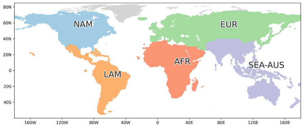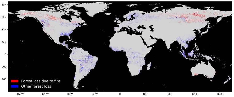 Global 30m forest cover loss map (Hansen et al 2013) for 2001-2019 (updated to include 2020-2024) is disaggregated into forest loss due to fire vs. other disturbance drivers. The map matches the sample-based area estimates of forest loss due to fire ± SE for all continents except Africa. This allows producing sub-regional map-based area estimates with a measure of uncertainty. The sum of map pixels with code 4 (high certainty of forest loss due to fire) corresponds to sample area estimate minus SE, adding code 3 (medium certainty) to code 4 (high certainty) pixels results in map area matching the sample-based area estimate, and adding code 2 (low certainty) pixels to codes 3 and 4 (medium and high certainty) yields map area matching sample area estimate plus SE. Code 5 corresponds to all forest loss due to fire in Africa; code 1 corresponds to forest loss due to other (non-fire) drivers. Dataset ReferenceTyukavina, A., Potapov, P., Hansen, M.C., Pickens, A., Stehman, S., Turubanova, S., Parker, D., Zalles, V., Lima, A., Kommareddy, I., Song, X-P, Wang, L. and Harris, N. (2022) Global trends of forest loss due to fire, 2001-2019. Frontiers in Remote Sensing https://doi.org/10.3389/frsen.2022.825190 [Open PDF]Data visualization using Google Earth Engine Appshttps://glad.earthengine.app/view/global-forest-loss-due-to-fireDataset Access in Google Earth EngineImage Collection id: users/sashatyu/2001-2024_fire_forest_lossData values: codes 2-4 - forest loss due to fire, low-high certainty (see description above), code 5 - all forest loss due to fire in Africa, code 1 - forest loss due to other (non-fire) drivers, code 0 - no data.Image Collection id: users/sashatyu/2001-2024_fire_forest_loss_annualData values: year of loss from Hansen et al. global map (codes 1-24 correspond to 2001-2024 loss) for the forest loss due to fire map matching sample area estimate (map codes 3+4, code 5 for Africa). No data = 0.Data DownloadMap data are provided in Geographic Coordinates (Lat/Long) using the WGS84 reference system.Data format: 8-bit unsigned LZW-compressed GeoTIFF. Pixel size is 0.00025 x 0.00025 degree. Data are aggregated into continental mosaics (see region boundaries and name abbreviations in the figure below).Download GeoTIFFs from hereFiles without "annual" in the name provide fire certainty levels for 2001-2024Data values: codes 2-4 - forest loss due to fire, low-high certainty (see description above), code 5 - all forest loss due to fire in Africa, code 1 - forest loss due to other (non-fire) drivers, code 0 - no data.Files with "_annual" in the name provide the year of loss for medium and high certainty fire pixelsData values: year of loss from Hansen et al. global map (codes 1-24 correspond to 2001-2024 loss) for the forest loss due to fire map matching sample area estimate (map codes 3+4, code 5 for Africa). No data = 0. Related Projects: Global Land Cover and Land Use Monitoring in Support of Environmental Sustainability Global Forest Watch Related Publications: Potapov, P., Tyukavina, A., Turubanova, S., Hansen, M. C., Giglio, L., Hernandez-Serna, A., Lima, A., Harris, N. & Stolle, F. (2025) Unprecedentedly high global forest disturbance due to fire in 2023 and 2024. Proceedings of the National Academy of Sciences, 122(30), e2505418122. Tyukavina, A., Potapov, P., Hansen, M.C., Pickens, A., Stehman, S., Turubanova, S., Parker, D., Zalles, V., Lima, A., Kommareddy, I., Song, X-P, Wang, L. and Harris, N. (2022) Global trends of forest loss due to fire, 2001-2019. Frontiers in Remote Sensing