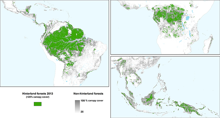 Indirect mapping of forest degradation is based on the elimination of intact areas, rather than direct mapping of degraded forests (GOFC-GOLD 2013). One such approach, applied globally using Landsat data, is the Intact Forest Landscape (IFL) product (Potapov et al 2008). Hinterland forest product presented here is an intermediate layer which complements the IFL concept through the implementation of a defined disturbance interval, in this case the twelve year forest loss record of Hansen et al. (2013). Hinterland forests are defined as forest patches absent of and removed from disturbance in near-term history. Forest is defined here as tree cover taller than 5m with canopy cover >=25% according to the product of Hansen et al. (2013). Criteria for the differentiation of hinterland forests are: a) distance from recent stand-replacement disturbance (>1 km); b) minimum forest patch size (100km2); c) connectivity of hinterland forest parches (minimum corridor width: 2 km); d) interval of extant forest (12 years). Hinterland forests are thematically different from the IFL which include both forests and non-forest ecosystems (Potapov et al 2008).For questions and additional data requests please contact Alexandra Tyukavina atyukav@umd.eduPlease, use the following credit when the provided data are cited: Tyukavina, A., Hansen, M. C., Potapov, P. V., Krylov, A. M., & Goetz, S. J. (2015) Pan‐tropical hinterland forests: mapping minimally disturbed forests. Global Ecology and BiogeographyLink to download 2013 hinterland forest layer: hinterland_2013.zip [42 Mb]ReferencesGOFC-GOLD 2013 A sourcebook of methods and procedures for monitoring and reporting anthropogenic greenhouse gas emissions and removals associated with deforestation, gains and losses of carbon stocks in forests remaining forests, and forestation. GOFC-GOLD Report versio (GOFC-GOLD Land Cover Project Office, Wageningen University, The Netherlands)Hansen M.C. et al. 2013 High-resolution global maps of 21-st century forest cover change Science 342 850-3Potapov P.V. et al. 2008 Mapping the world's Intact Forest Landscapes by remote sensing. Ecology and Society 13 51